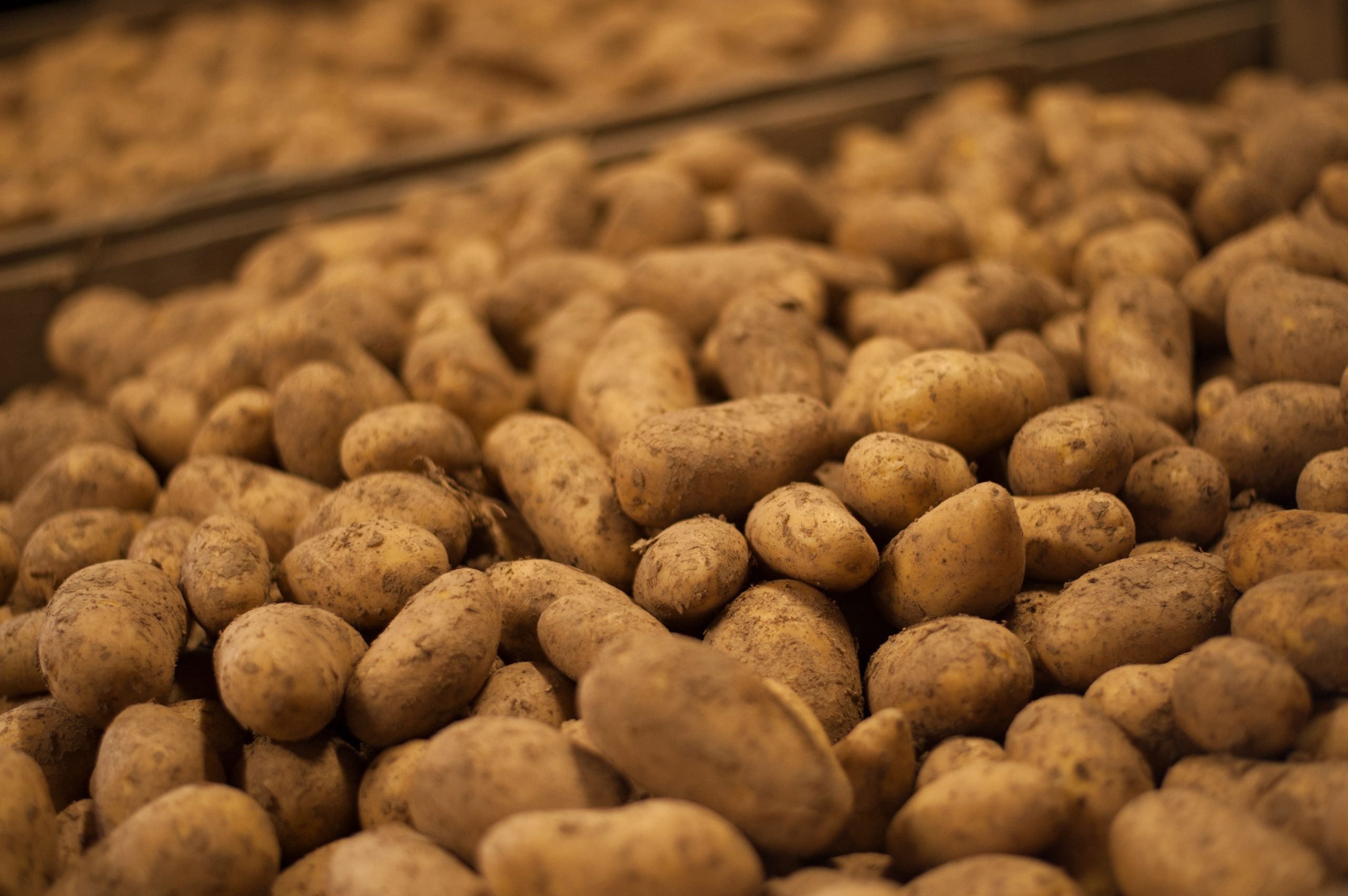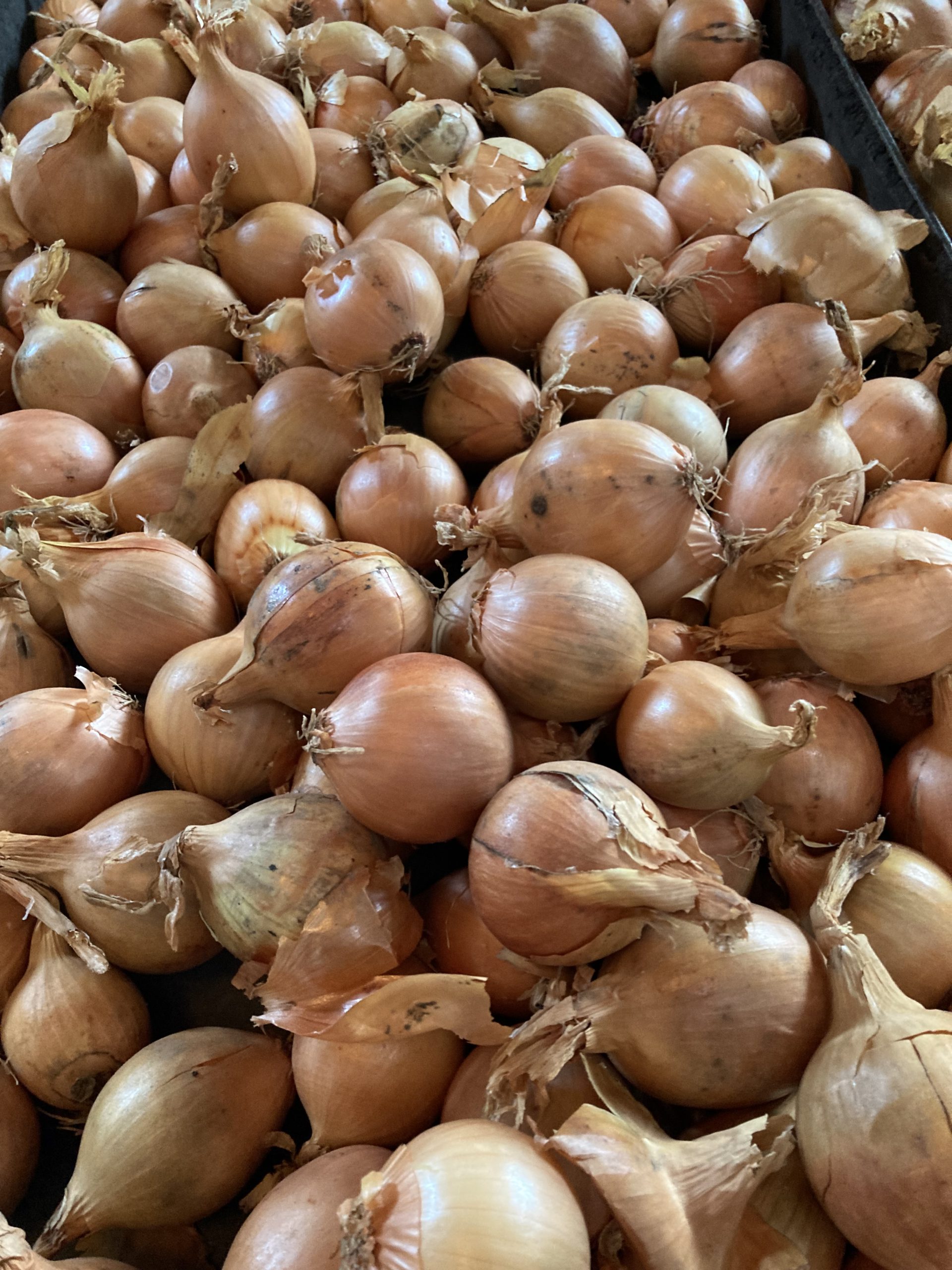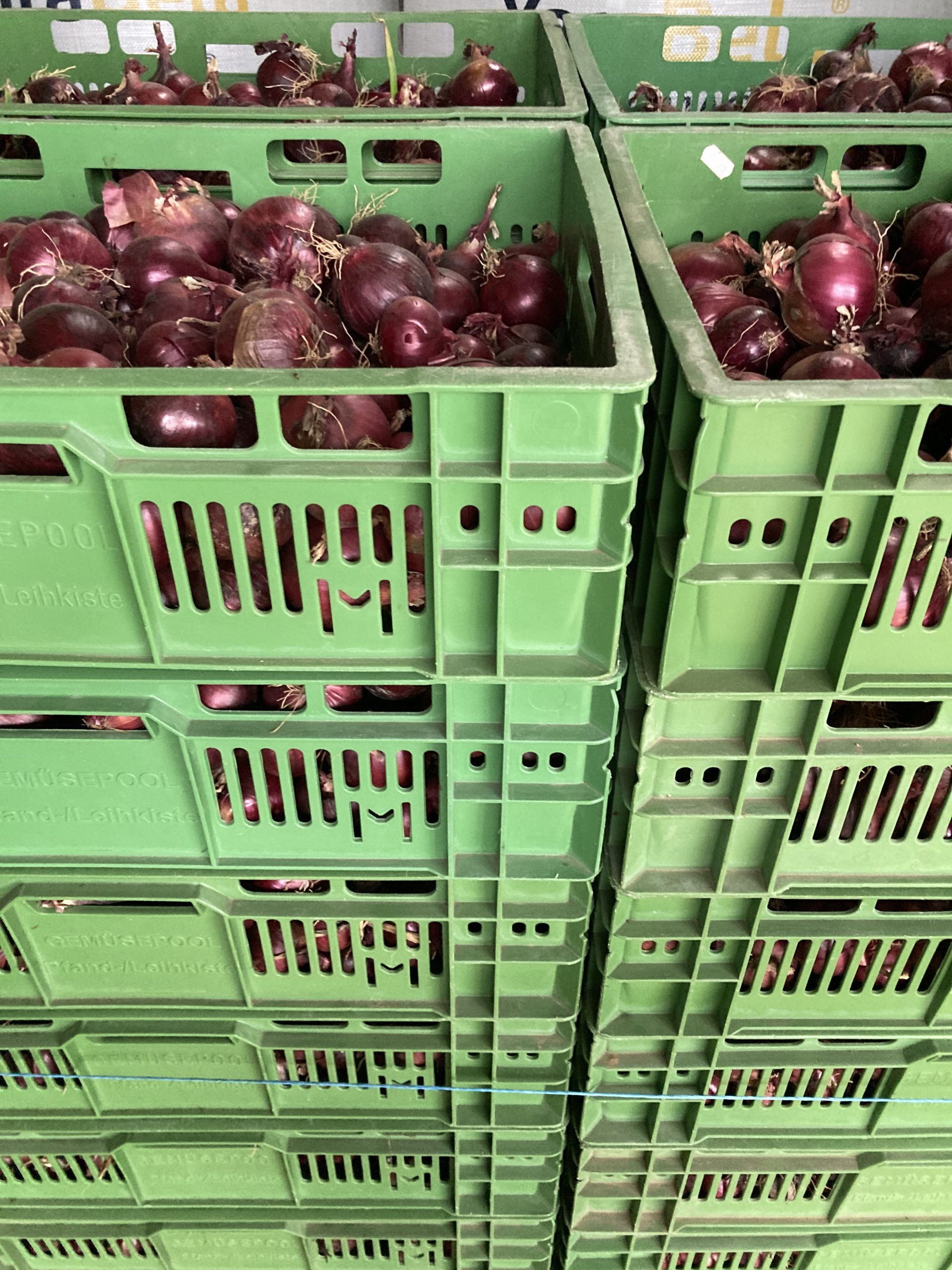 Die geernteten Feldfrüchte wie Kartoffeln und Zwiebeln werden sortiert und eingelagert.
